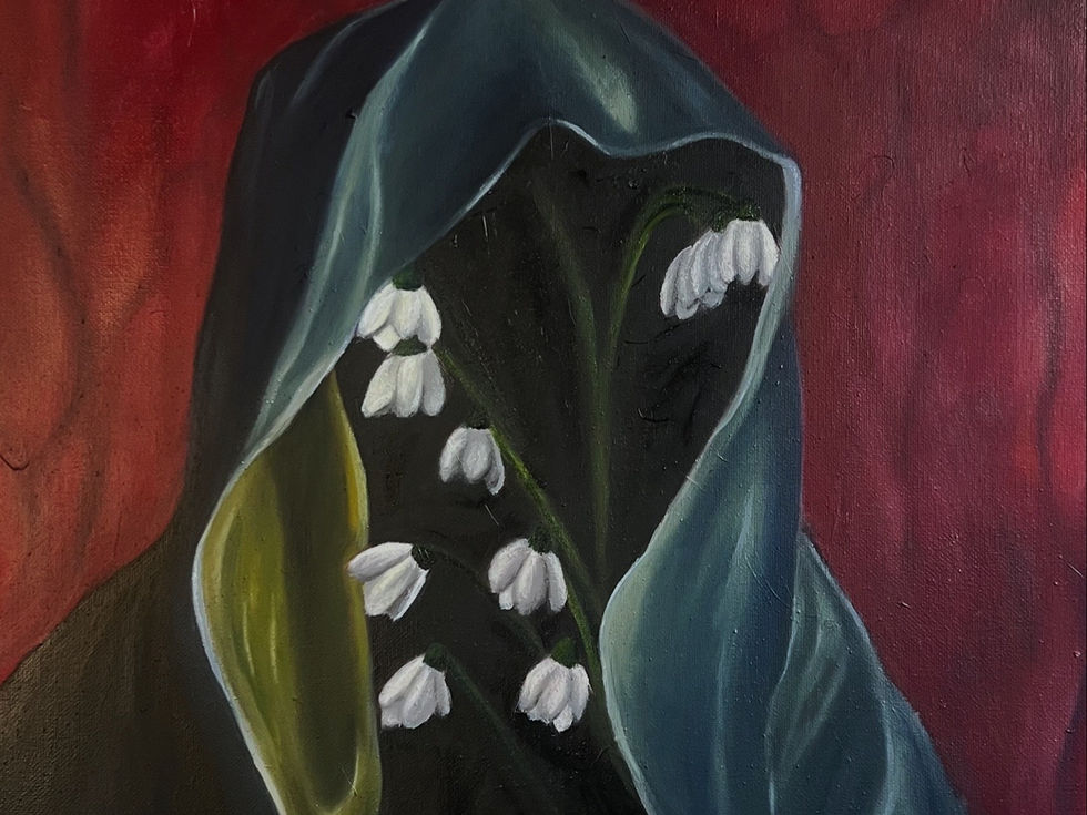 Custodia Innecontiae zeigt eine fragile Gruppe von Schneeglöckchen, die behutsam von einer dunklen, gesichtslosen Figur umhüllt und beschützt werden – wie ein Wächter der Unschuld. Das schattenhafte Tuch wirkt wie ein stiller Hüter, der sich selbst auflöst, um das Zarte zu bewahren. Der Hintergrund in tiefen Rottönen, durchzogen von feinen Adern, erinnert an pulsierendes Leben – als würde man in das schlagende Herz einer schützenden Seele blicken. Die Schneeglöckchen stehen für Reinheit, Neubeginn und Hoffnung, eingebettet in ein Bild von stiller Fürsorge und seelischer Tiefe. Custodia Innecontiae ist ein Werk über Verletzlichkeit, Schutz und die stille Kraft, das Unversehrte zu bewahren – selbst inmitten innerer Stürme.