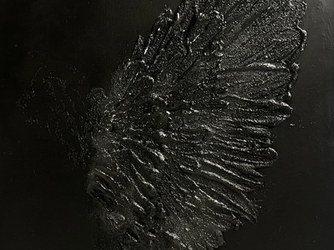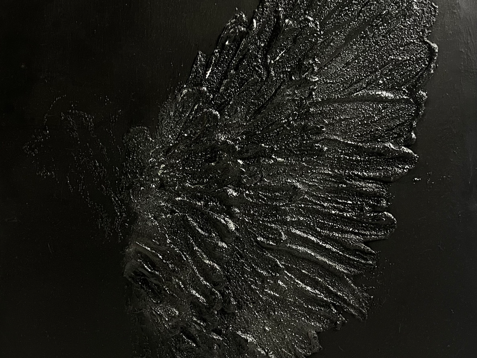 Ein einzelner Flügel erhebt sich aus der Dunkelheit, als hätte sich ein Engel aus dem Schatten selbst geformt. Die reliefartige Textur lässt Licht nur an wenigen Stellen durchbrechen, was dem Werk eine geheimnisvolle Lebendigkeit verleiht. Es wirkt wie ein Fragment von etwas Grösserem - ein Symbol der Befreiung oder das Verlussts. In völligen Schwärze liegt keine Leere, sondern eine stile Kraft, die zwischen Schmerz und Hoffnug schwebt. Dieses Kunstwerk spricht ohne Farbe, aber Tiefe - es lässt Raum für Stille, für Andacht, für Wiederaufstieg.